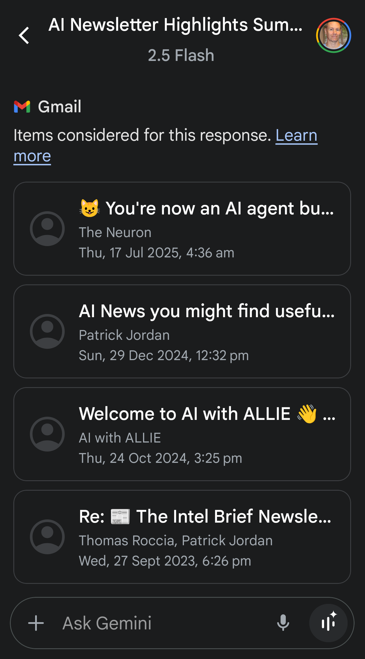 My Gmail task for Claude was summarizing emails, specifically any AI newsletter emails, as I subscribe to a big number of those, so if Claude or Gemini could do a good/great job on this it would be nice time saver. My prompt to Claude was as simple as it gets (and I’ll want to refine this if this becomes a regular task):